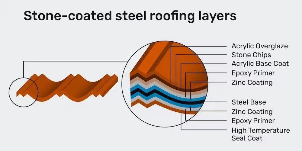 Stone coated metal roof tiles are manufactured using a high-quality galvanized steel base coated with natural stone chips and protective acrylic layers.